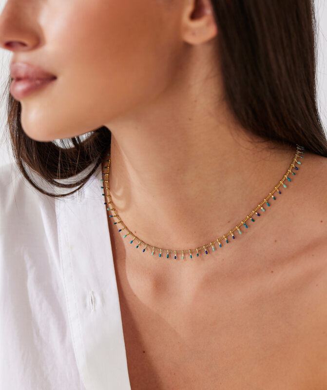 Short necklace with gold chain and small enamel rays in blue and turquoise color.