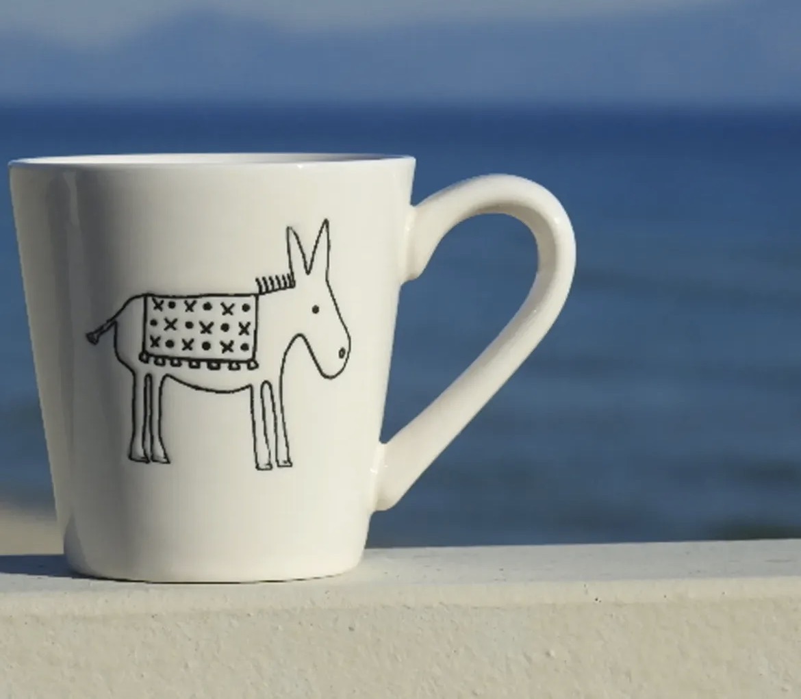 This espresso-coffee cup has the design etched into the clay, which is then coloured black as a wonderful contrast to the off-white/cream glossy cream ceramic cup itself. The design is not just printed in black on the surface of the cup, it’s much nicer!