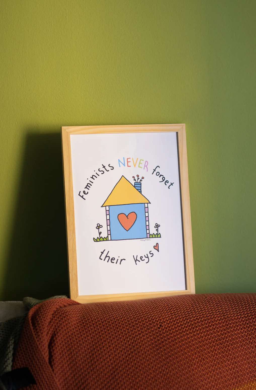 This bold and charming poster features the playful feminist tagline “Feminists Never Forgets Their Keys” paired with a warm, symbolic design of a house with a heart at the centre. It’s a celebration of independence, self-love, and the everyday victories that make women unstoppable—big or small.