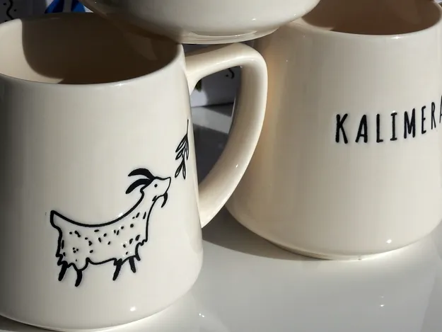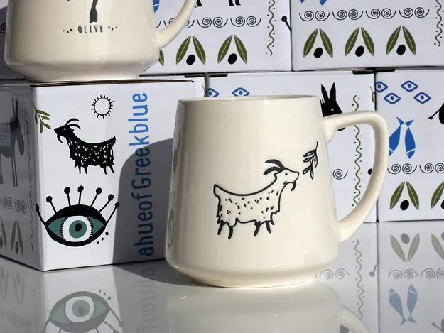 This mug has the design etched into the clay, which is then coloured black as a wonderful contrast to the off-white/cream glossy cream ceramic cup itself. The design is not just printed in black on the surface of the cup, it’s much nicer! The  Goat & Olive design is on the front side of the cup.