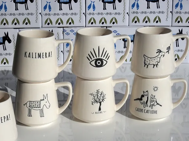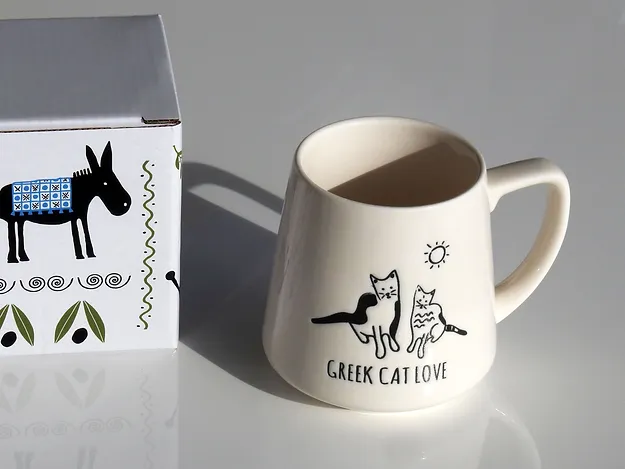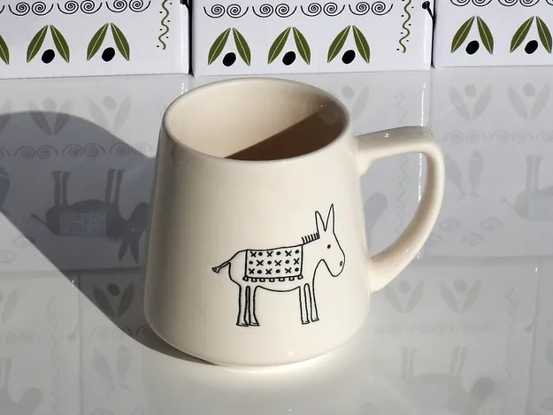 This mug has the design etched into the clay, which is then coloured black as a wonderful contrast to the off-white/cream glossy cream ceramic cup itself. The design is not just printed in black on the surface of the cup, it’s much nicer! The Greek Donkey design is on the front side of the cup.