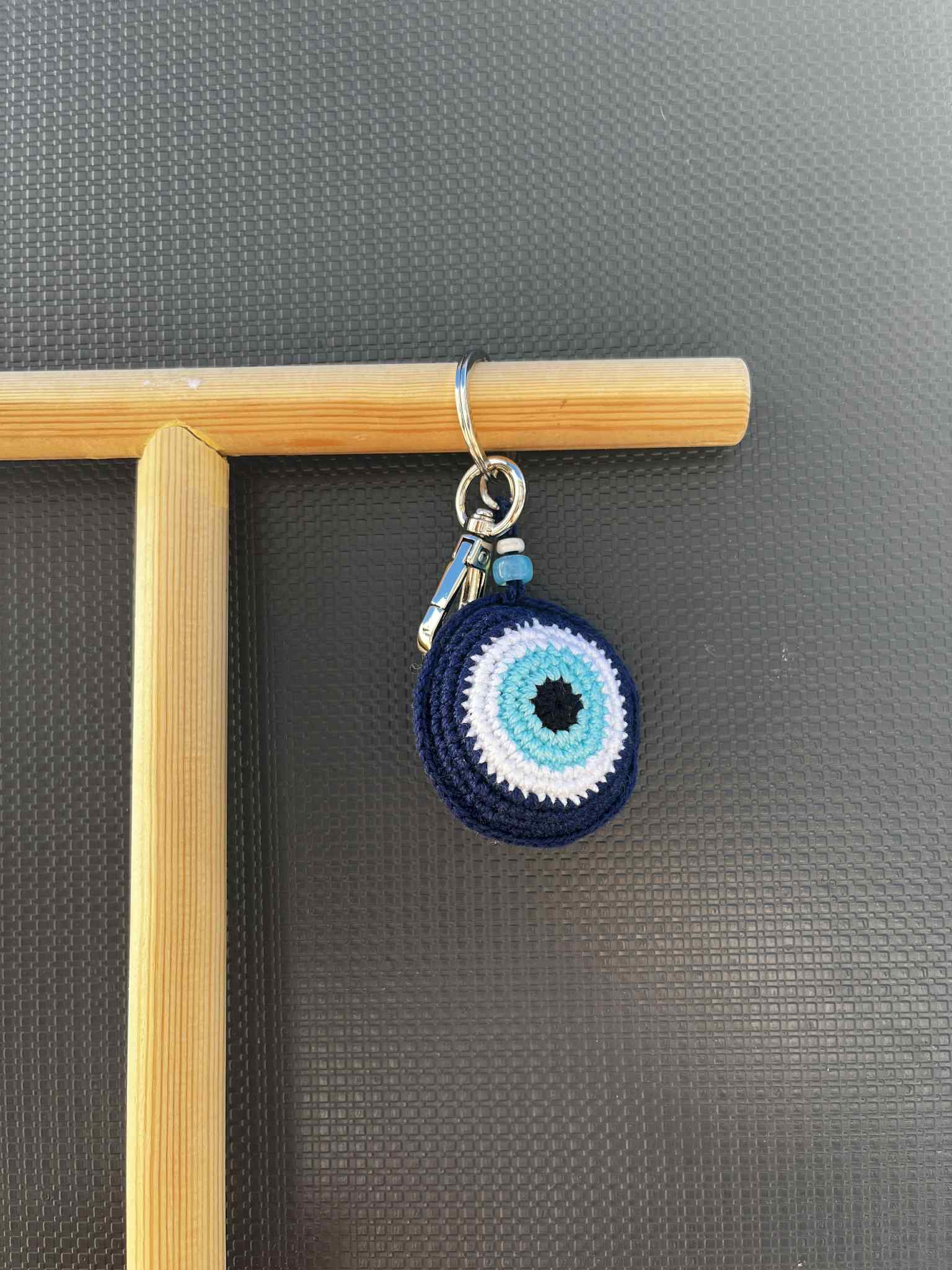 Bring cooler, charm, and protection wherever you go with this hand-crocheted Evil Eye Keyring. Made with vibrant yarn. This piece adds a stylish touch to your keys, bag or backpack. Each keyring is carefully crafted by hand, making every one unique.