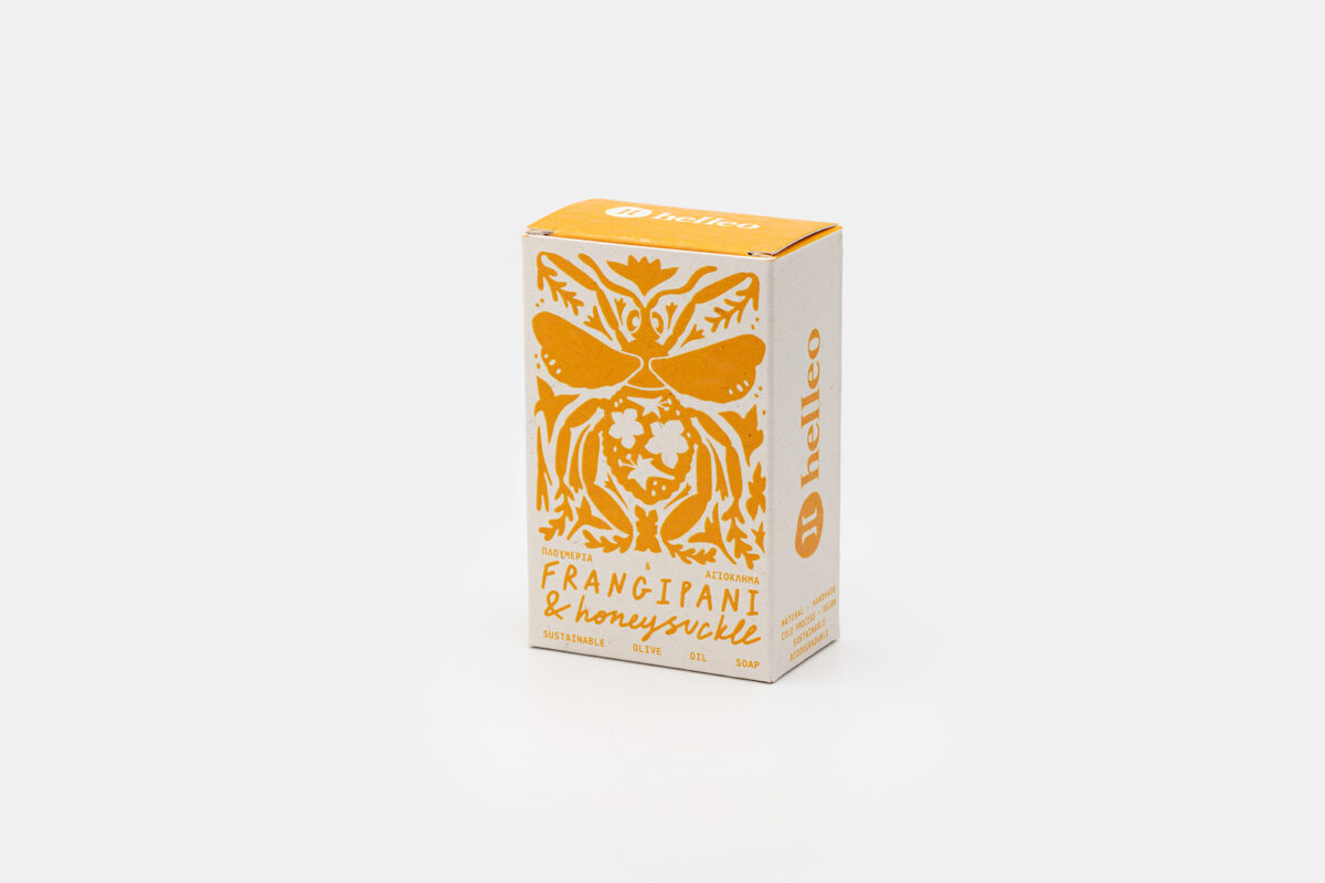 This soap blend is made from the shrub layer of Helleo’s food forest, which has major aesthetic value and highly attracts various pollinators. It’s made with their own fresh olive oil infused with two heaven-scent varieties of frangipani and honeysuckle blossoms, handpicked patiently one by one during summer and autumn.