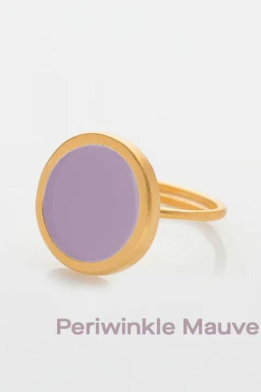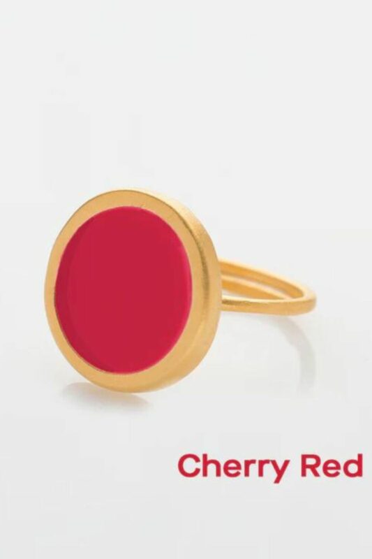 This piece of jewelry is made of brass featuring a 24K gold plating. The inside surface is coated with coloring resin.