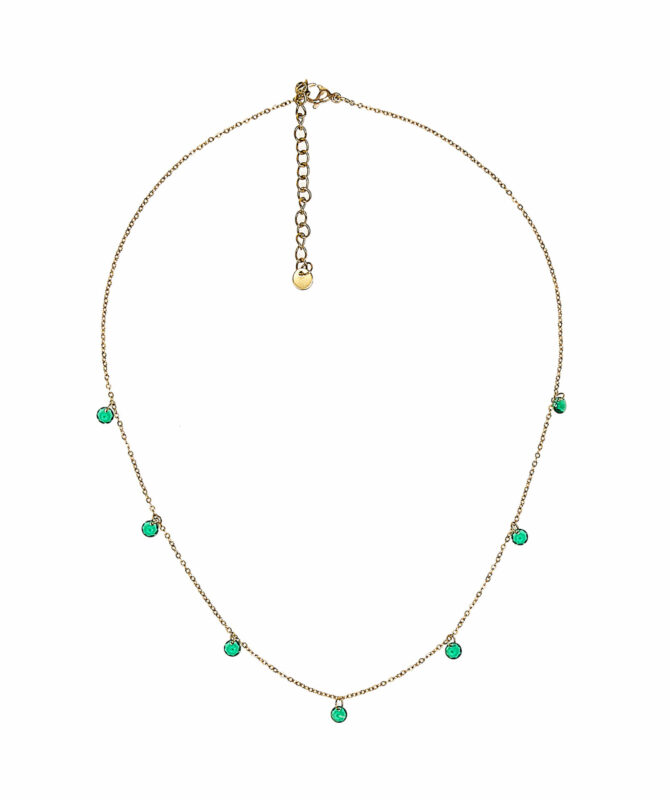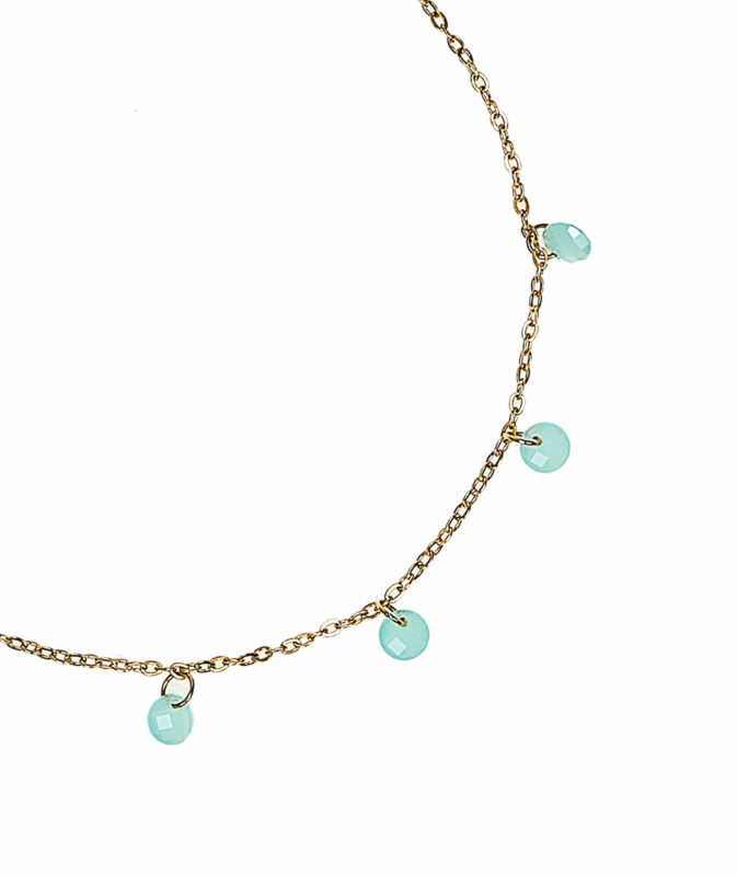 Gold chain bracelet with scattered semi-precious stones in mint color.